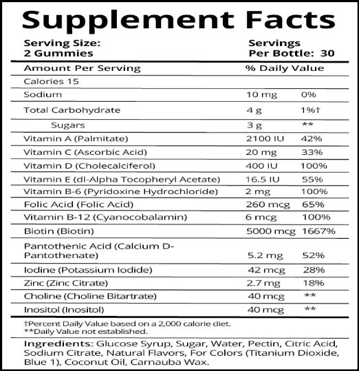 Vitamin A, Vitamin C, Vitamin D, Vitamin E, Vitamin B-6, Folic Acid, Vitamin B-12, Biotin, Pantothenic Acid, Iodine, Zinc, Choline, Inositol